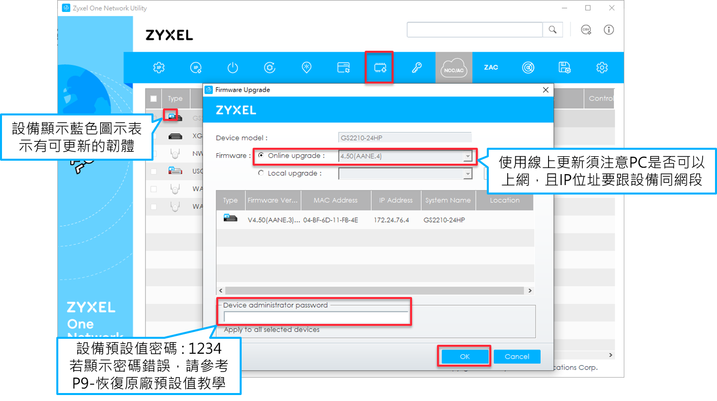 - 若預設密碼無效,表示設備曾連上雲端。請至 Nebula 平台「站點 > 一般設定」查詢目前之設備密碼。