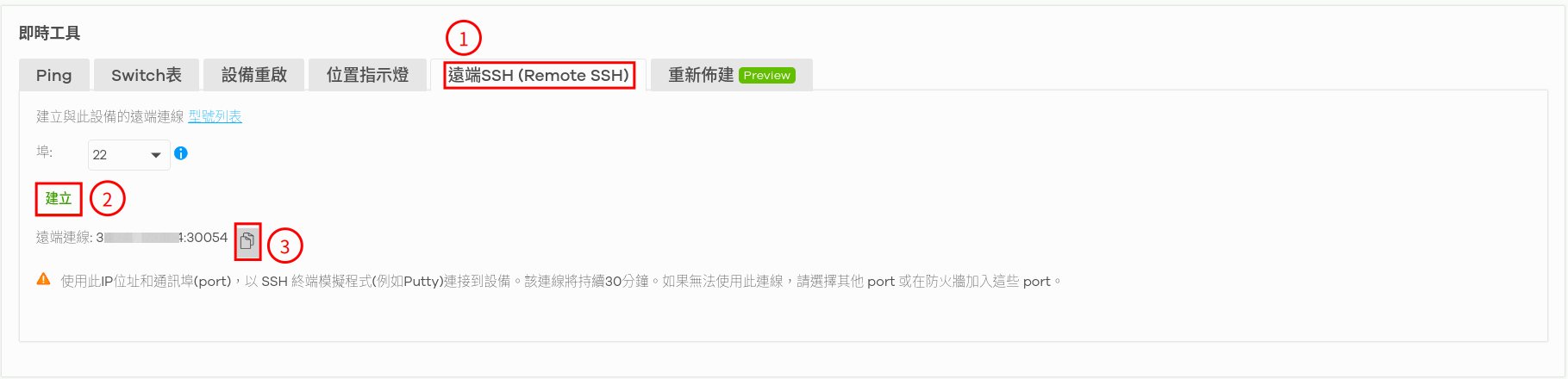 使用「遠端 SSH」選項,您可以透過指定服務連接埠號碼並依照下列步驟,建立與 Nebula AP 的遠端 SSH 連線: