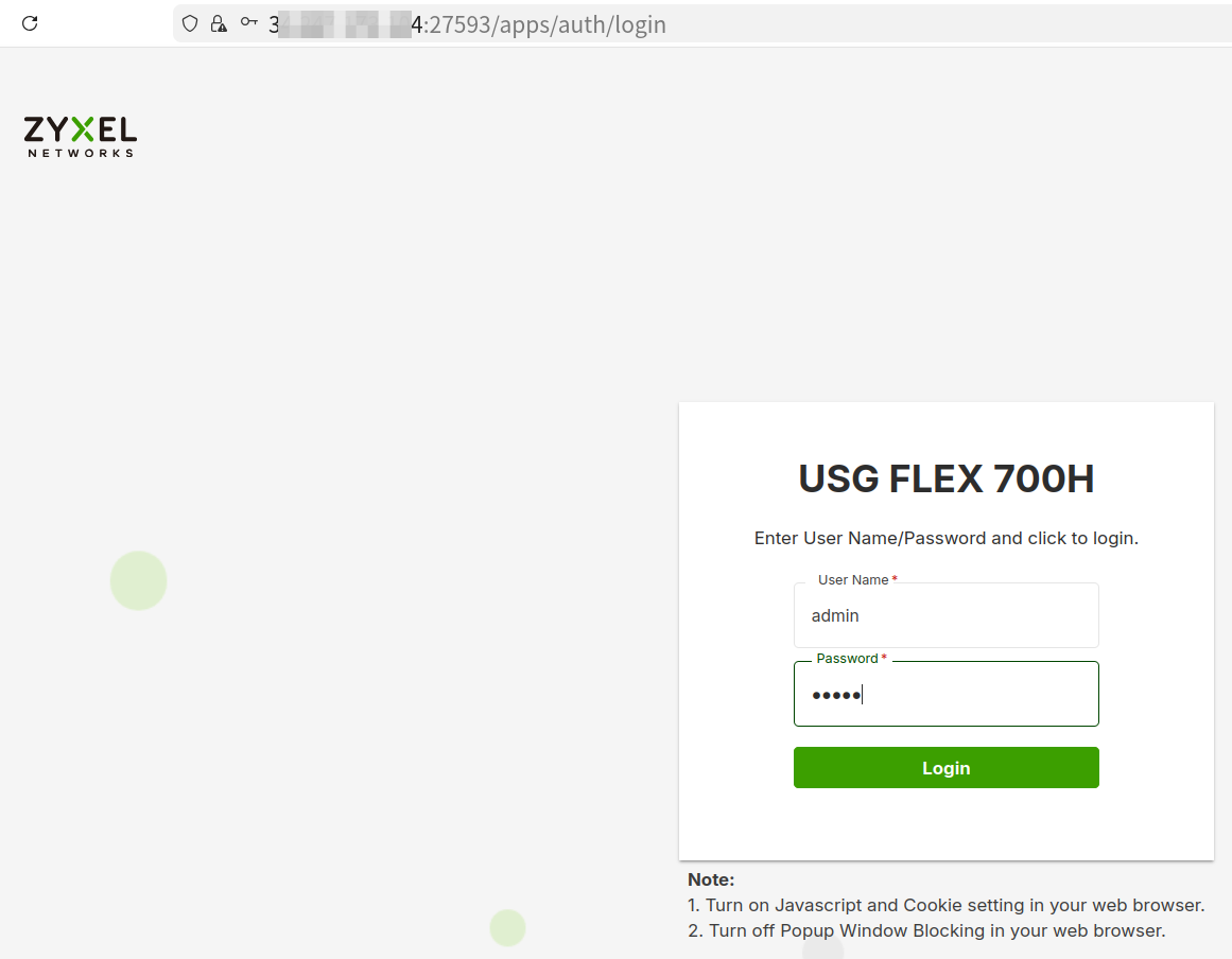 將複製的連結貼到瀏覽器中,成功存取遠端頁面,然後輸入使用者名稱和密碼登入防火牆。