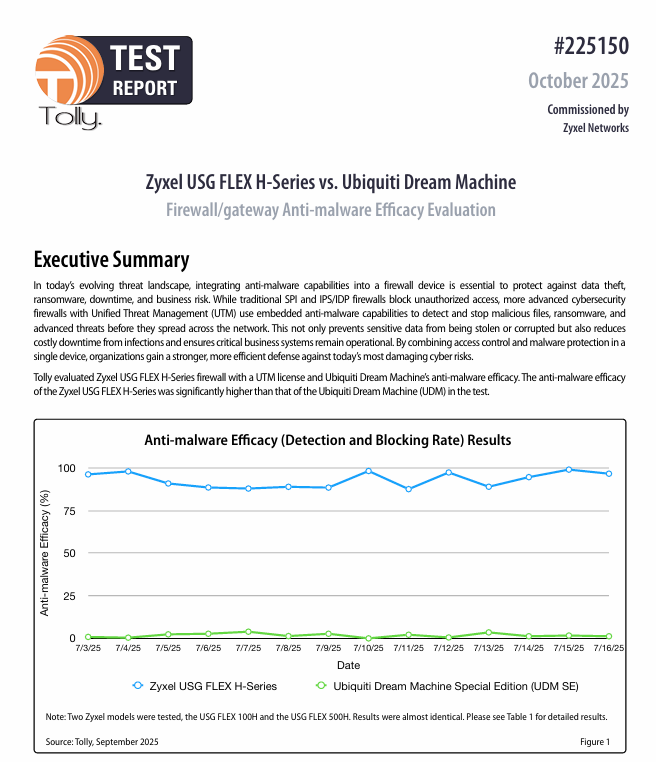 最近,Tolly Enterprises 發布了一份獨立測試報告(報告編號 #225150),比較了 Zyxel USG FLEX H 系列與 Ubiquiti Dream Machine SE (UDM SE) 在惡意軟體防護效能上的表現。 以下是為 IT 和資安專業人員整理的關鍵洞察摘要。